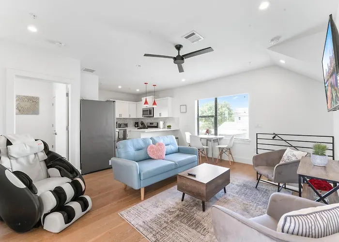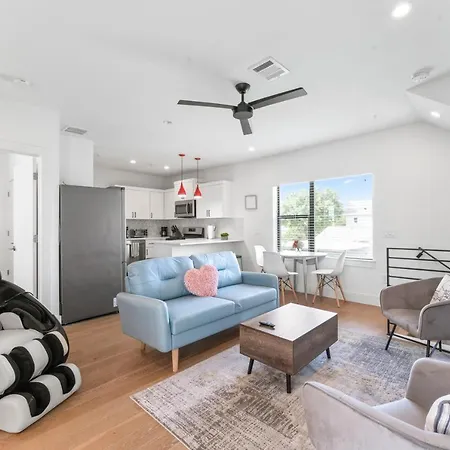 El Luxe East Downtown 3Br Condo es un acogedor refugio que te invita a disfrutar de la vibrante vida de Austin. A tan solo 2.5 km del Frank Erwin Center y 3.5 km del Texas Memorial Stadium, este encantador espacio cuenta con todas las comodidades necesarias para unas vacaciones inolvidables. Con wifi gratuito y un patio privado, te sentirás como en casa desde el primer momento. Las estancias son amplias y luminosas, equipadas con aire acondicionado, televisión y una cocina completa que incluye cafetera y lavadora. Cada una de las tres habitaciones garantiza un descanso reparador, con tres baños bien equipados, perfectos para relajarte después de un día explorando la ciudad. Las toallas están disponibles, asegurando una experiencia cómoda y sin preocupaciones.